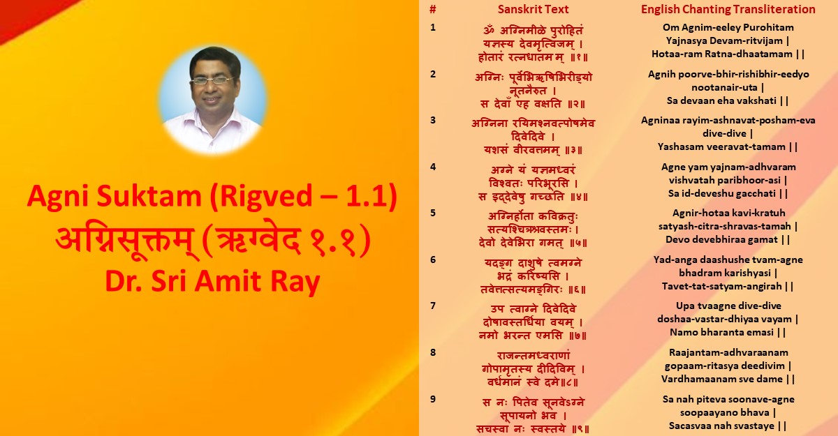 Below is the complete Agni Suktam (Rigveda 1.1), presented with the original Sanskrit in Devanagari script, standard IAST transliteration for accurate pronunciation, and a detailed explanation of the meaning and symbolism for each verse.