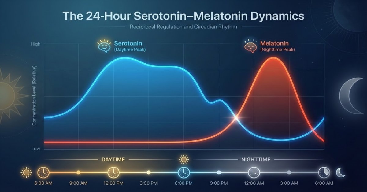 This reciprocal dynamic—diurnal serotonin accumulation and nocturnal depletion with concomitant melatonin surge—provides essential temporal cues for sleep–wake regulation, mood stability, and feedback to the SCN itself.